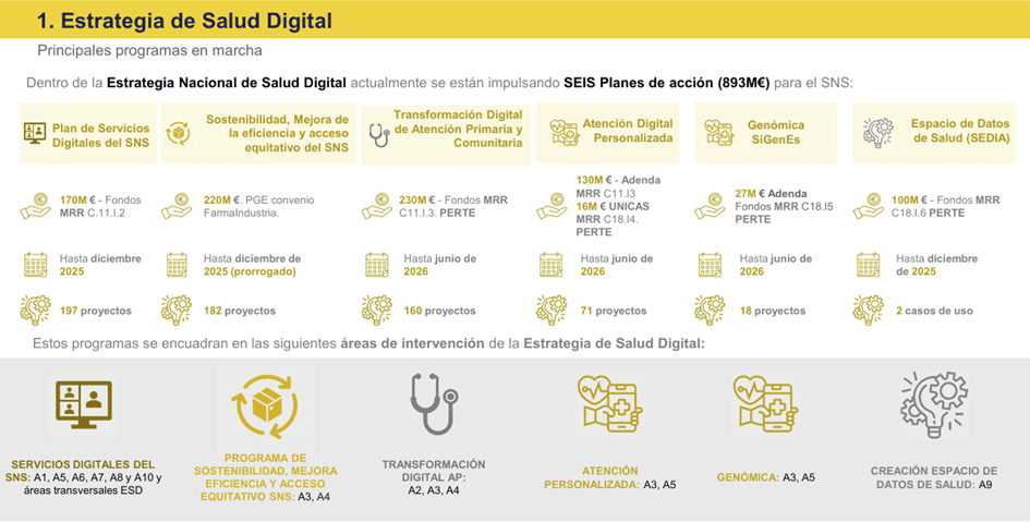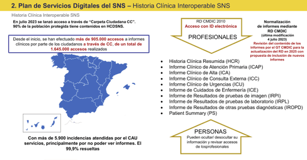 El Ministerio de Sanidad, al informar de la situación perteneciente a junio de 2025, destaca la transformación digital de la atención primaria y comunitaria, el establecimiento del Espacio Nacional de Datos de Salud, el desarrollo del Sistema de Información Genómica (SiGenES), y los avances en la interoperabilidad clínica a través del Nodo de Interoperabilidad del SNS.